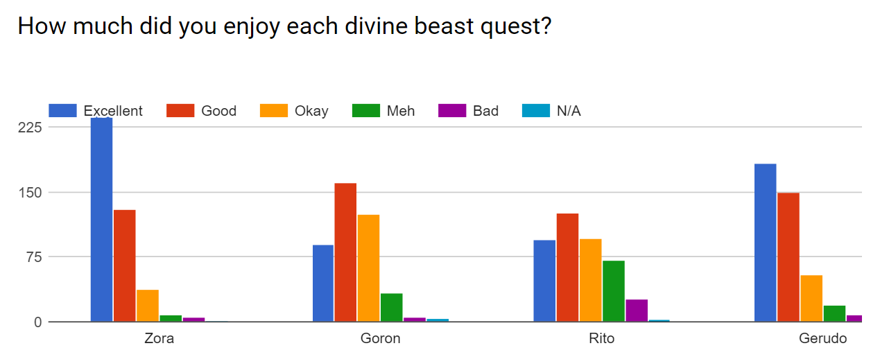 What is your favorite divine beast quest in Zelda Breath of the Wild? What order should you play the quests in to enjoy the game the most? In March, I posted a survey on the Zelda subreddit. I published results related to dungeon order and difficulty here and results of how the master sword affected difficulty here. I’ve finally had some time to go deeper into the results to see which divine beast people enjoy the most.